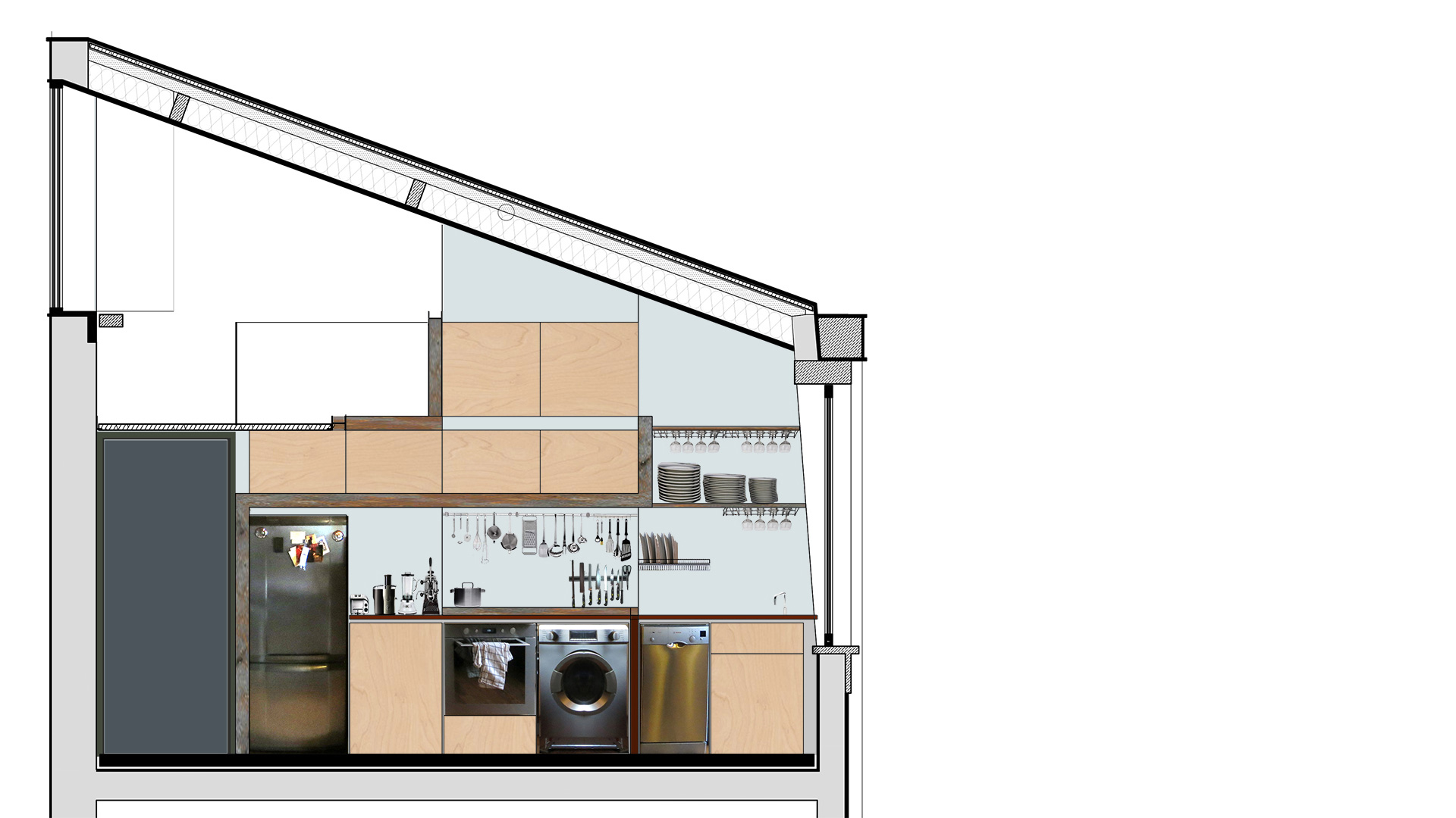 Daylight floods into the space through a large roof glazing. A wall library is made of thin folded metal, a crude steel structures the mezzanine and colored wood adorns the kitchen cabinets.