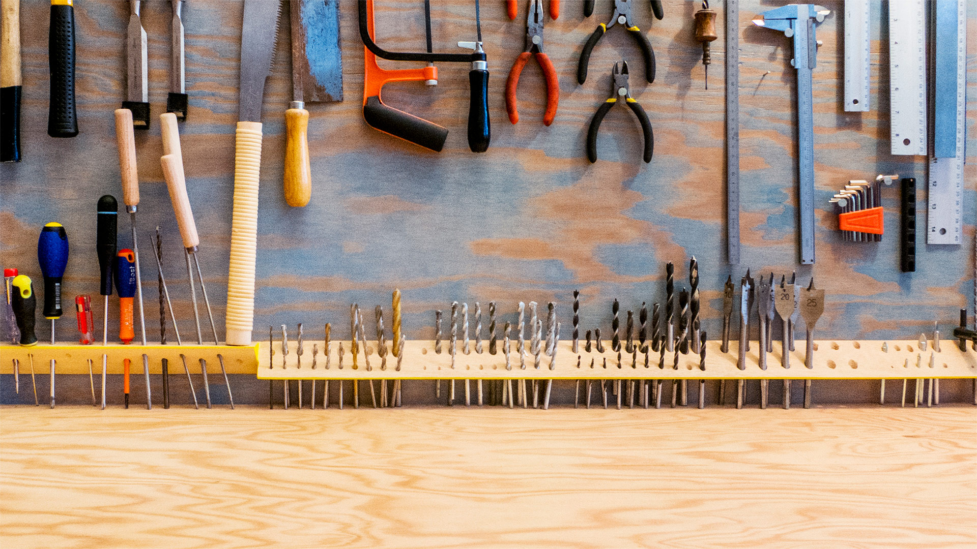 Our workshop table is composed of two wooden surfaces, one to work on and the other, painted in a transparent blue, offers a backdrop resembling water which contrasts with the tools it displays. A rail system on this vertical plane holds bright yellow containers for screws, nails and so forth.
