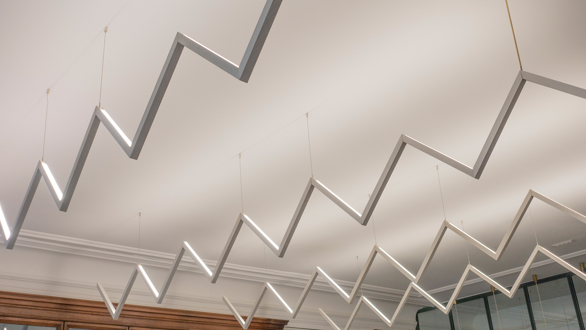 Reminiscent of the shape of lightning, this light suspension brings rhythm and movement to a room. Wooden profiles tinted in white are held together by a modular metal structure which allows for zig zags of different lengths.